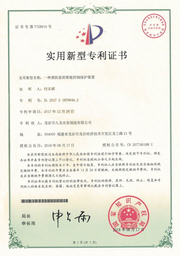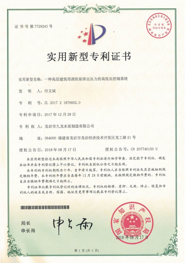 給水設(shè)備(全數(shù)字變額)外觀設(shè)計專利證書