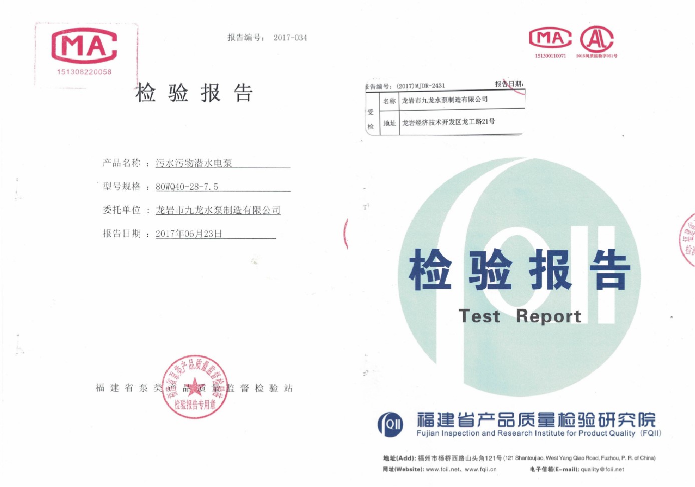 污水污物潛水電泵檢驗報告